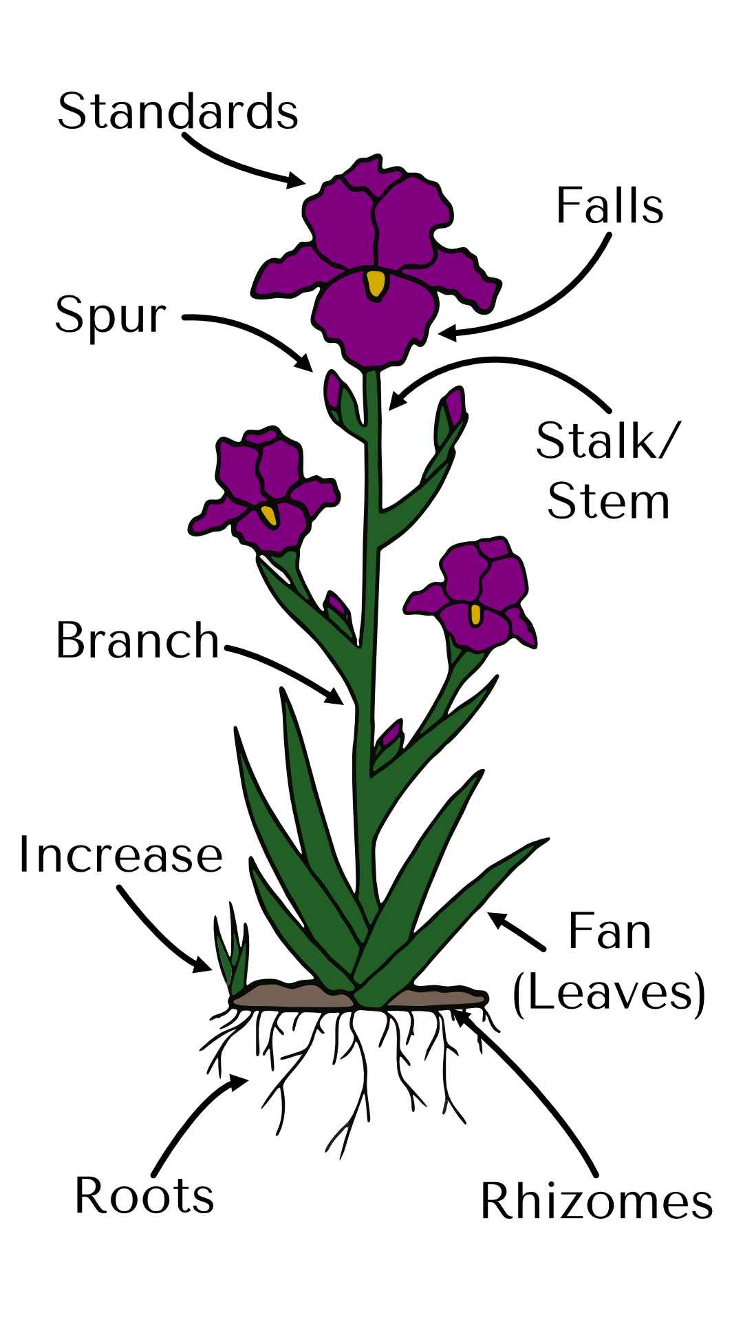 All hobbies and interests have terminology to describe elements of the hobby, and irises are no different. Colours, patterns, growth habit and parts of the plant all have names which are useful to know. Below is a list of terms we use.